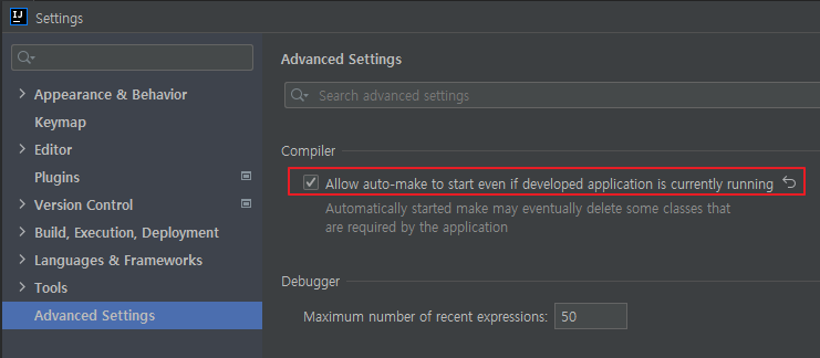 - Settings > Advanced Settings > Allow auto-make to start even if developed application is currently running 체크