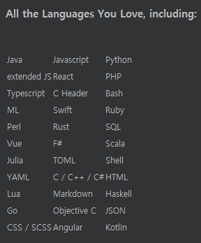 Java, Javascript, Python, Vue 외에도 매우 다양한 언어를 지원한다.